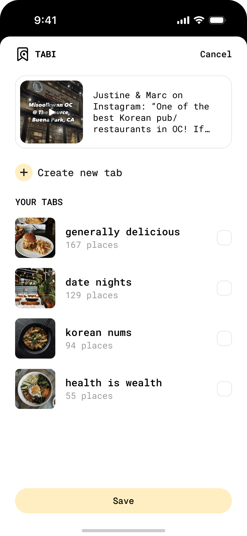 Tabi needs to improve visibility of saves. Saved content should be easily actionable, not buried.